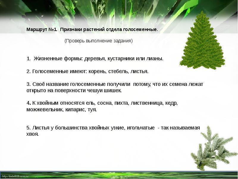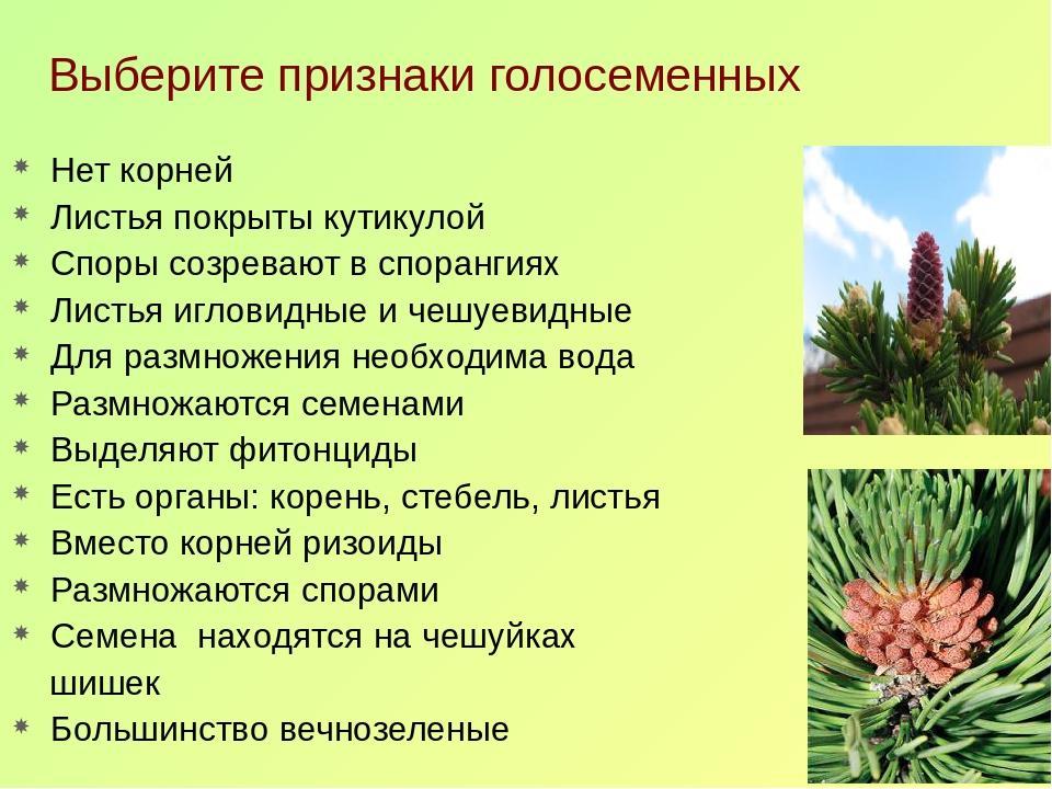 При размножении голосеменные растения производят не споры, а семена, поэтому их относят к семенным растениям. Семенными растениями также являются цветковые, или покрытосеменные, растения. Отличие голосеменных от покрытосеменных связано с тем, что голосеменные не образуют плодов, их семена как бы ничем не покрыты, они лежат на поверхности чешуй шишек. Представителями голосеменных являются ель, сосна, лиственница, кедр и другие растения.