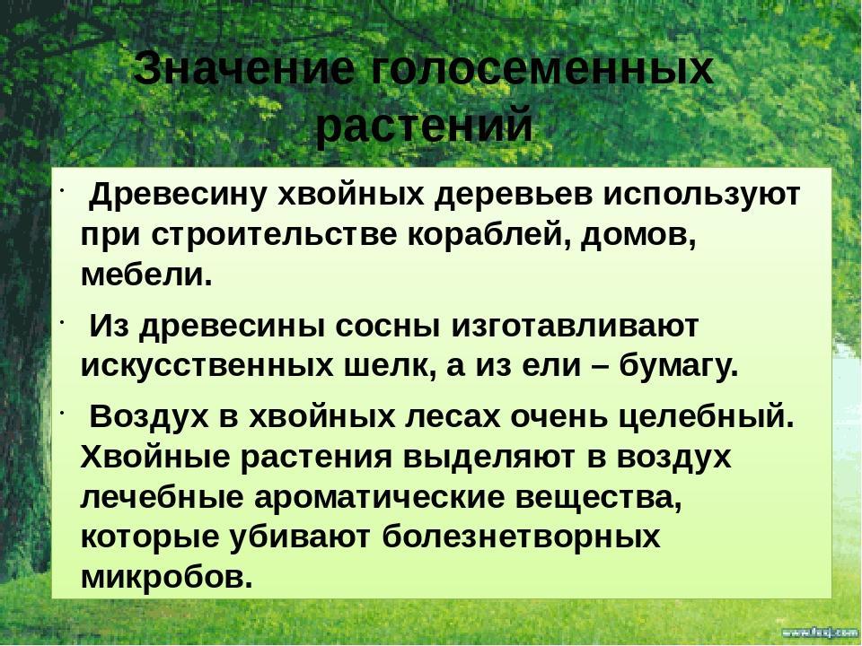 У большинства голосеменных листья имеют вид иголок (хвоинок) или чешуек. Среди голосеменных выделяют большую группу хвойных растений. Хвойные растения образуют леса, участвуют в почвообразовании, используется их древесина, хвоя, семена и др.