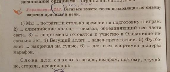 1) Мы не зря потратили столько времени на подготовку к играм. 2) Недаром олимпийские кольца — символ, объединяющий все части света. 3) Поэтому спортсмены готовятся к участию в Олимпиаде несколько лет. 4) Бегущий атлет случайно задел препятствие. 5) Футболист сгоряча накричал на судью. 6) Неожиданно для всех спортсмен выиграл марафон.
