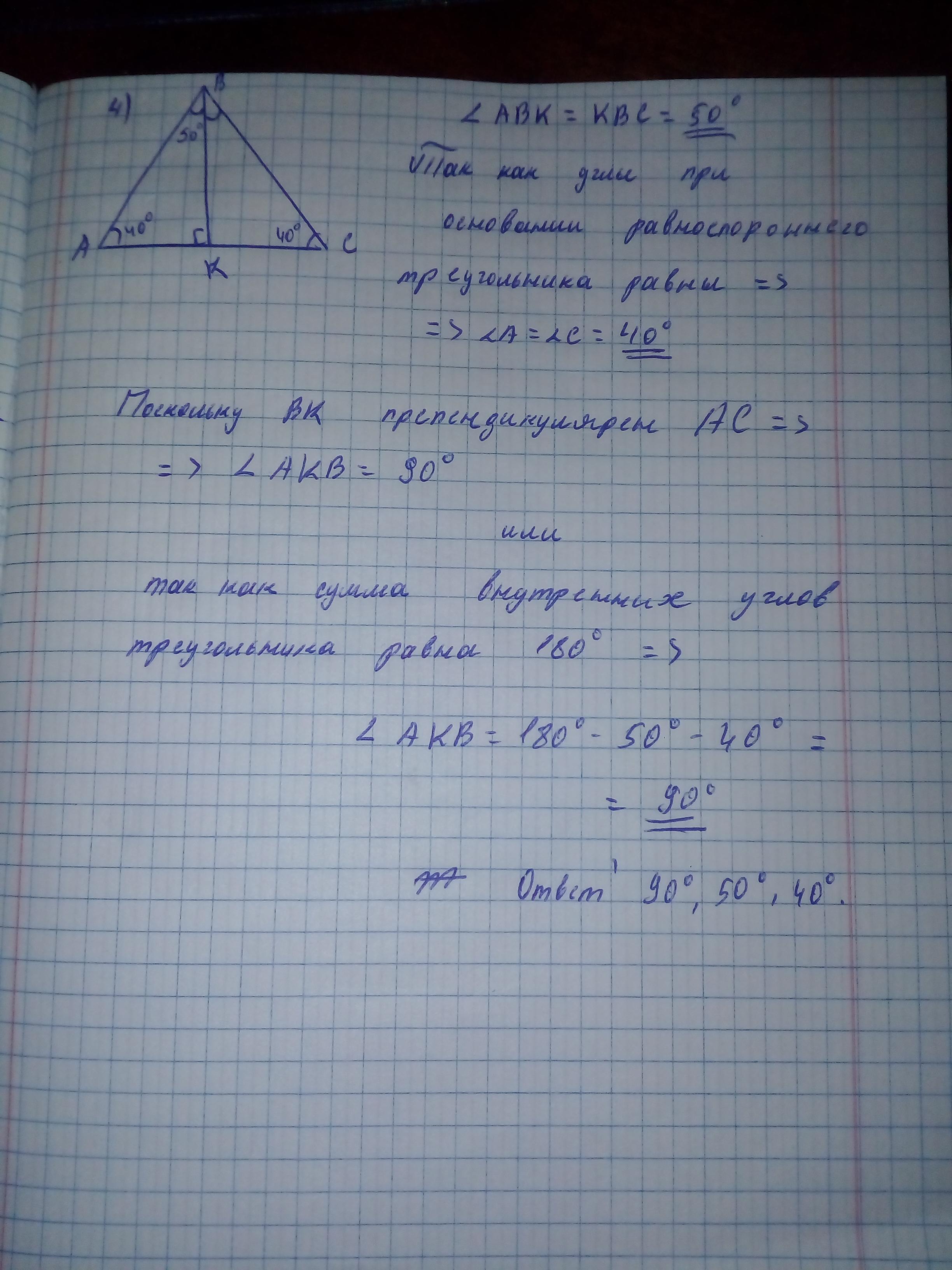 Ответ: √А = 40°, √АВК = 50°, √АКВ = 90°