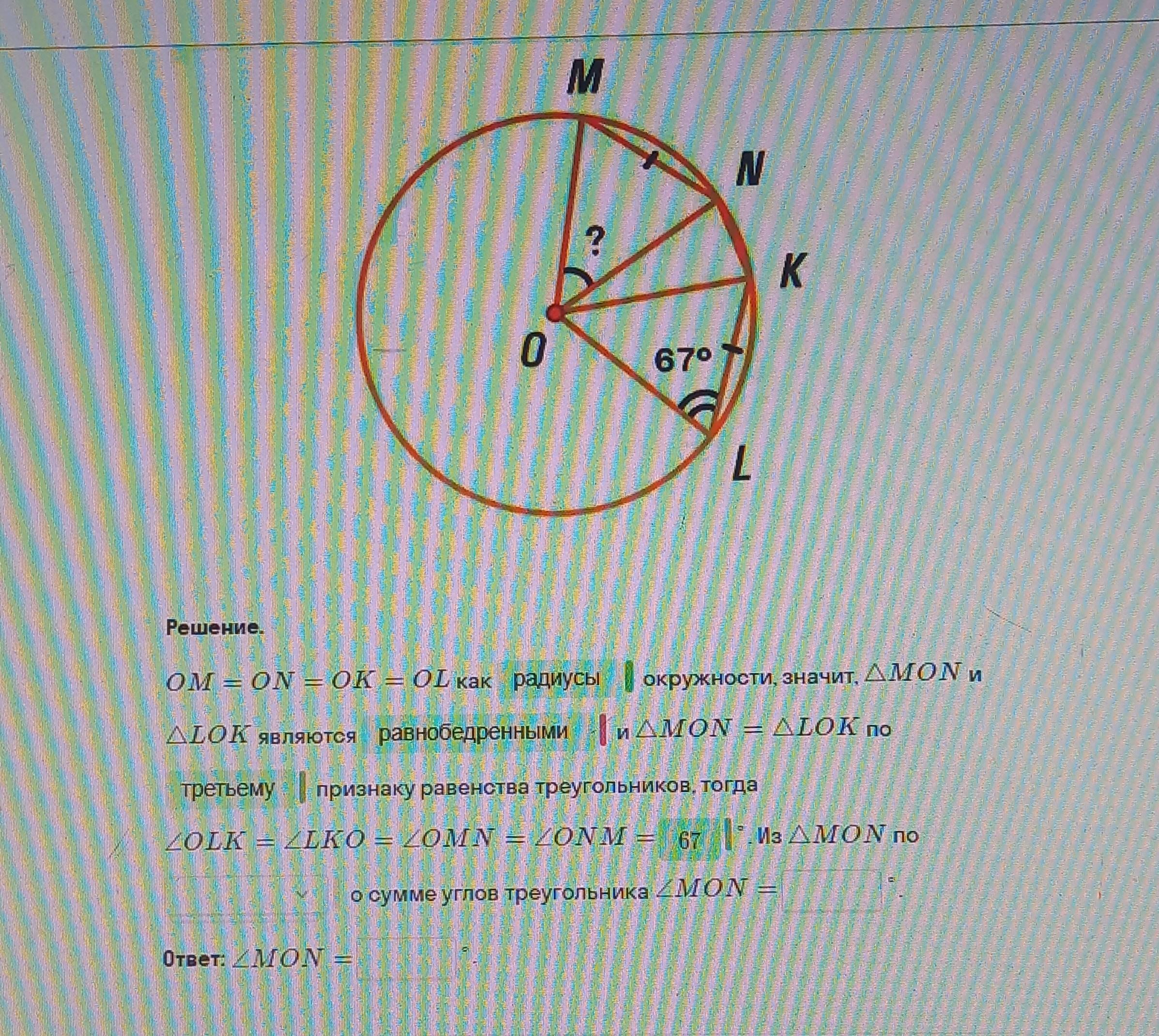 46⁰, тк у.OMN и у.ONM равны(67⁰), то через теорему о сумме углов треугольника мы и найдем угол MON