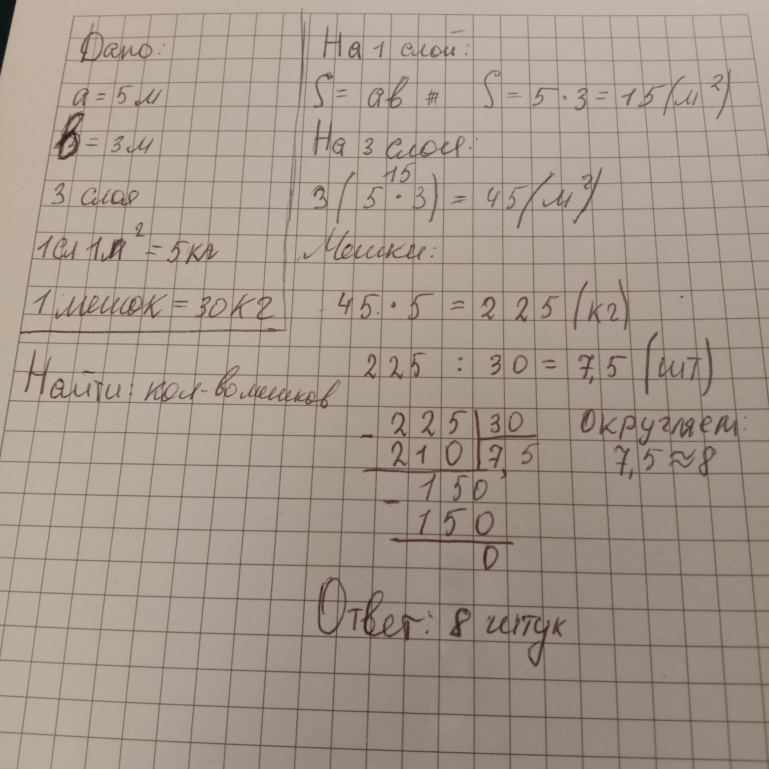 Итак, сначала нам нужно выяснить площадь стены. Затем умножить ее на 3 (ведь у нас 3 слоя). Когда мы это сделаем, то умножим полученный результат на 5, находя общее количество штукатурки, которая нам понадобится. Ну и, наконец, "разложим штукатурку по мешкам", разделив на 30. Получился не целый ответ, поэтому округляем до 8 (по правилам округления и логики, ведь когда половина мешка остаётся, то это лучше, чем когда его не хватает.