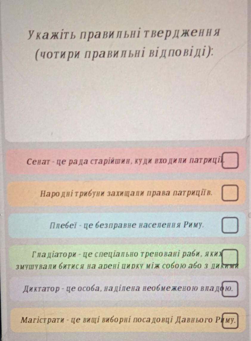 Твердження: "Народні трибуни захищали права патриціїв". НЕВІРНЕ, так як народні трибуни захищали права плебсу.