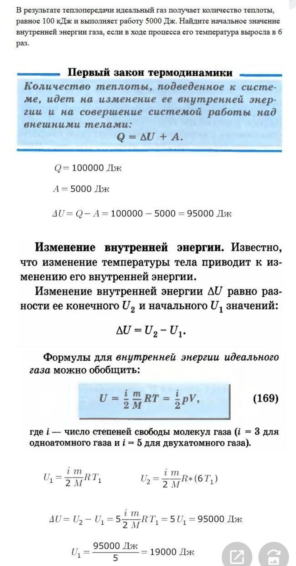 У результаті теплопередачі ідеальний газ отримує кількість теплоти , що дорівнює 100 кДж , i виконує роботу 5000 Дж . Знайдіть початкове значення внутрішньої енергії газу , якщо в ході процесу його температура зросла в 6 разів