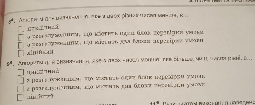 8. Алгоритм для визначення, яке з двох чисел менше є алгоритм з розгалуженням, що містить один блок перевірки умови.