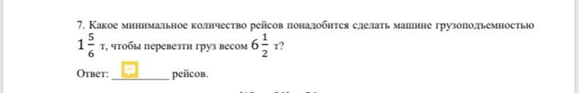 Чтобы определить количество рейсов нужно разделить общий вес груза на грузоподъемность машины: 6 1/2: 1 5/6 = 13/2: 11/6 = 39/11 = 3 6/11; Получилось не целое число. Это означает, что три рейса машина сделает с полной загрузкой, а еще один рейс - с частичной загрузкой. В общей сложности потребуется четыре рейса. Ответ: потребуется 4 рейса.