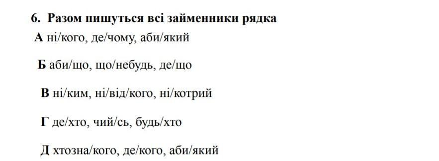 6. Разом пишуться всі займенники рядка А ні/кого, де/чому, аби/який Б аби/що, що/небудь, де/що В ні/ким, ні/від/кого, ні/котрий Г де/хто, чий/сь, будь/хто Д хтозна/кого, де/кого, аби/який