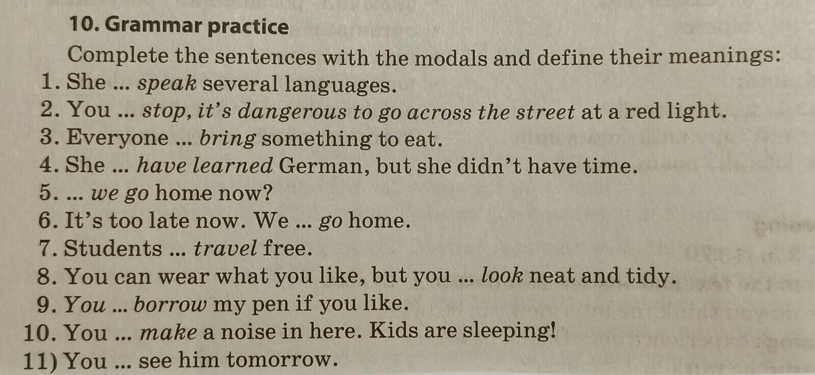 ДОПОМОЖІТЬ БУДЬ ЛАСКА ДУЖЕ ПОТРІБНО ШВИДКО ДО ЗАВТРА ДАЮ 100 БАЛІВ Grammar practice Complete the sentences with the modals and define their meanings: 1. She ... speak several languages. 2. You stop, it's dangerous to go across the street at a red light. 3. Everyone... bring something to eat. 4. She ... have learned German, but she didn't have time. 5. ... we go home now? 6. It's too late now. We ... go home. 7. Students travel free. 8. You can wear what you like, but you look neat and tidy. 9. You... borrow my pen if you like. 10. You make a noise in here. Kids are sleeping! 11) You ... see him tomorrow.
