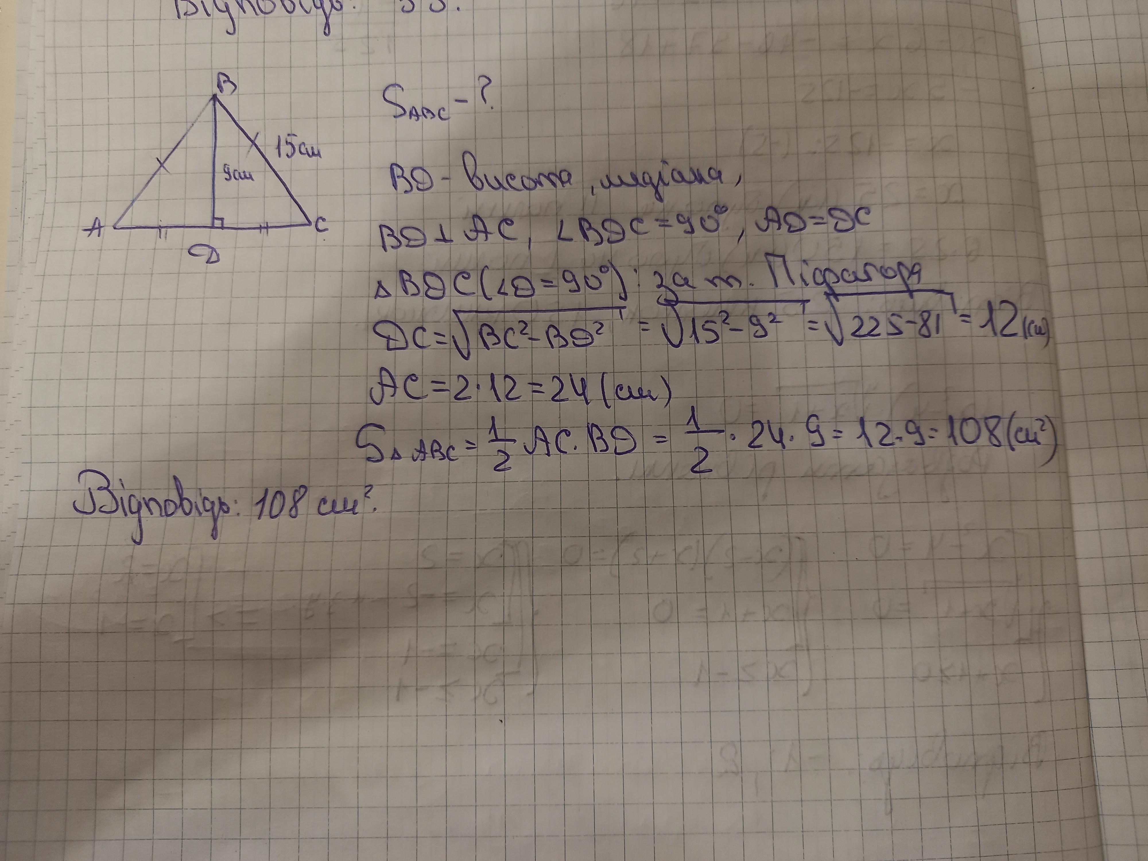 проведена до основи – 9 см. Знайдіть площу трикутника.