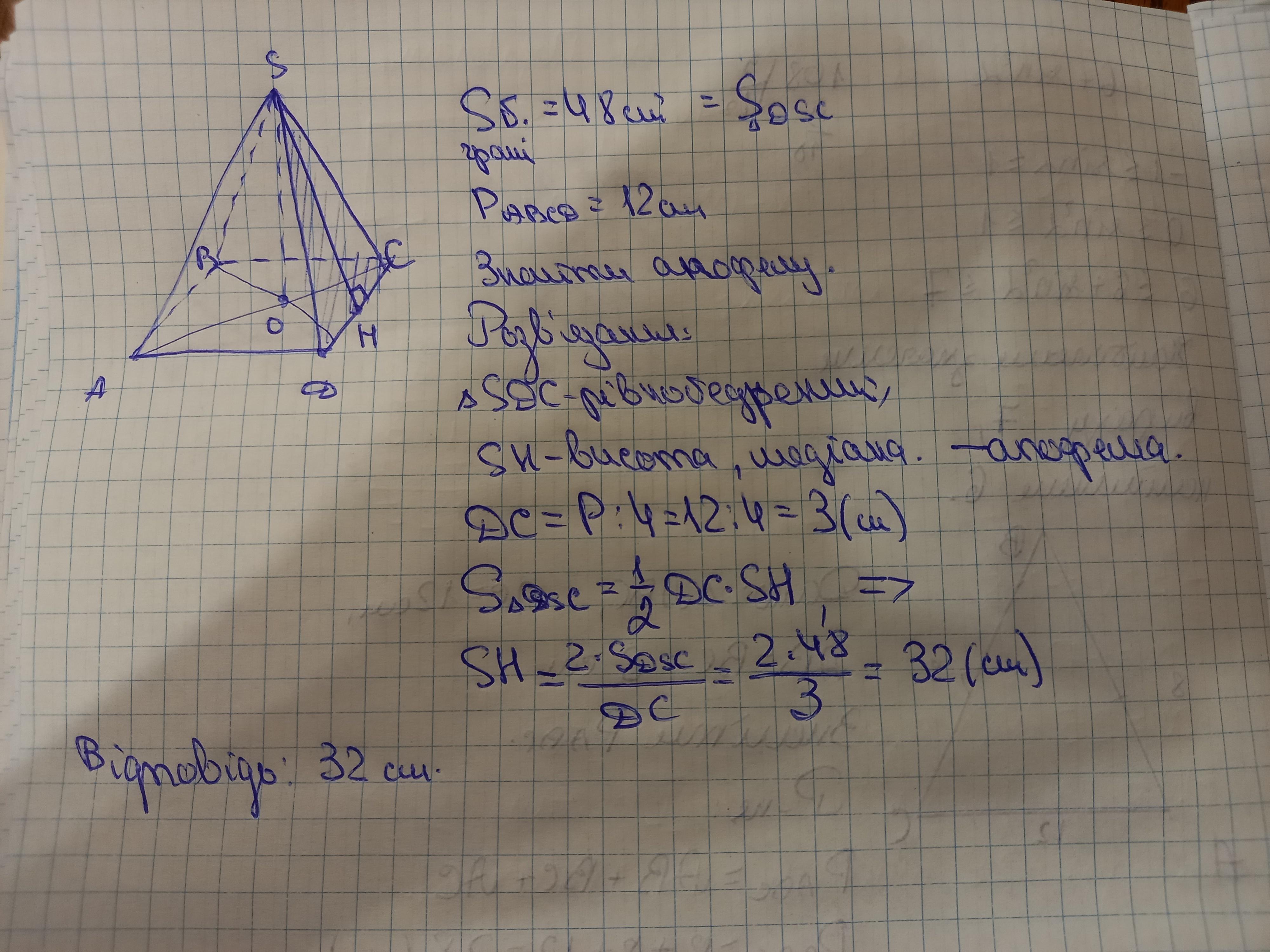 Площа бічної грані правильної чотирикутної піраміди дорівнює 48 см², а периметр основи - 12 см. Обчислити апофему піраміди