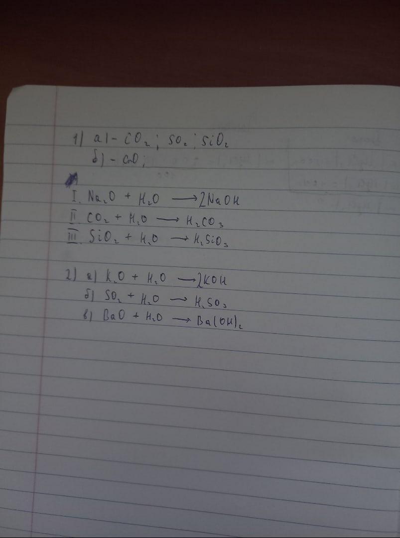 допоможіть будьласка! 1)Із наведеного переліку випишіть в окремі стовпчики формули оксидiв: а) кислотних; б) основних. Na,O, P,O, CO2, SO2, Cro, Cu,O, SiO2, Mn,O,Які з наведених оксидiв взаємодіють iз водою? Складіть вiдповiднi рiвняння реакцій. Na₂O, CO₂, SO₂, Cro, SiO₂ 2) Доповніть схеми реакцiй i назвiть продукти реакції: a) К,О + НО → ......; 6) SO2 + H2O B) ...... + H2O → Ba(OH),