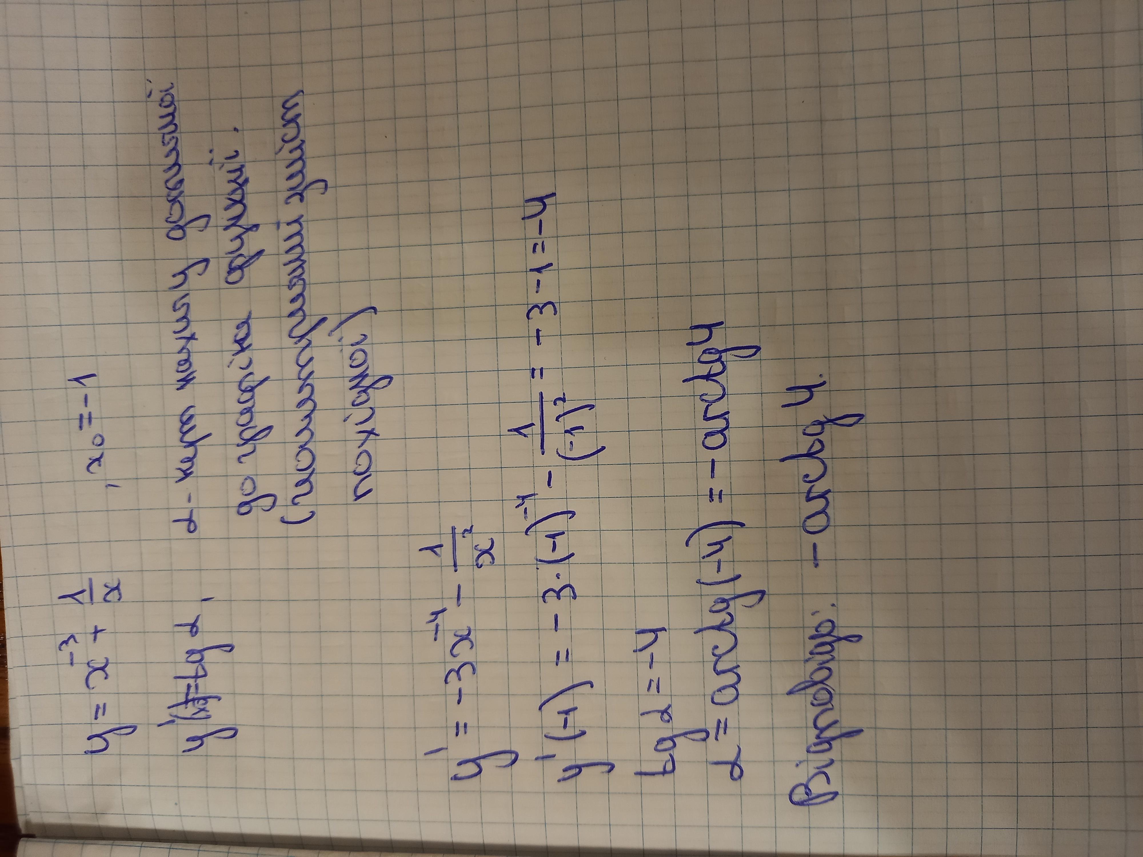 4. Знайдіть кут нахилу дотичної до графіка функції у = x^−3 +1/х в точці х0 =-1 з віссю абсцис.