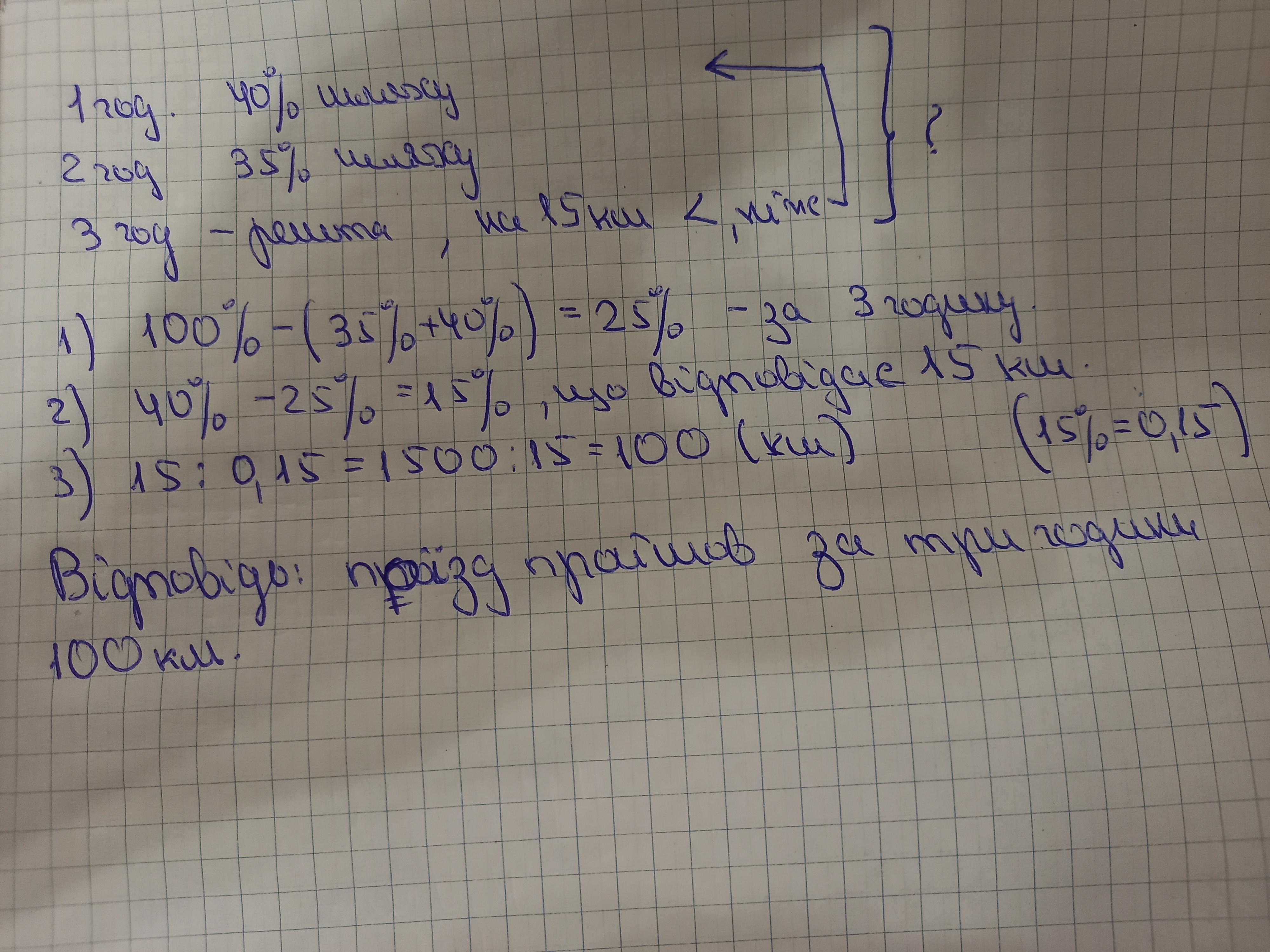 За першу годину поїзд пройшов 40% усього шляху, за другу - 35% усього шляху, а за третю годину - решту. Яку відстань пройшов поїзд за три години, якщо за третю годину він пройшов на 15 км менше, ніж за першу?