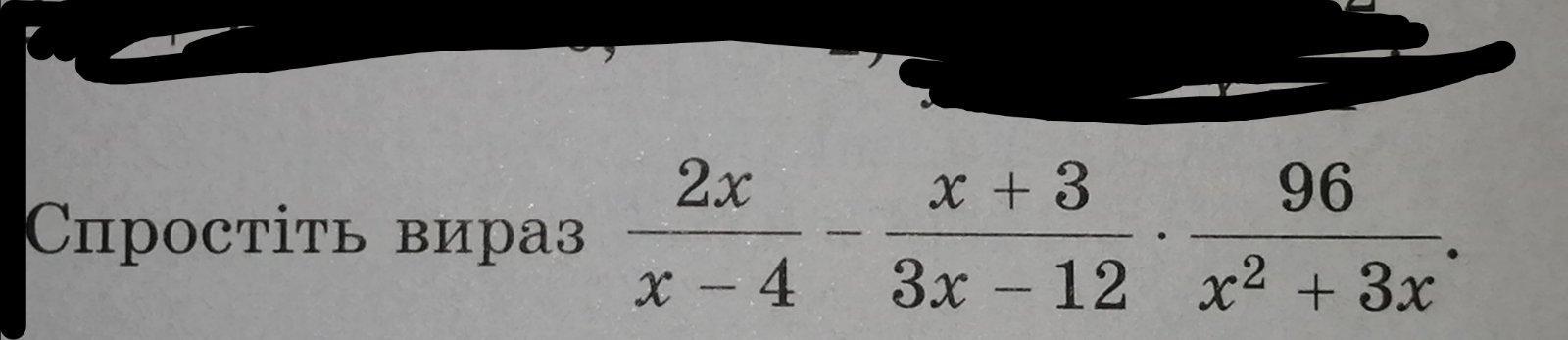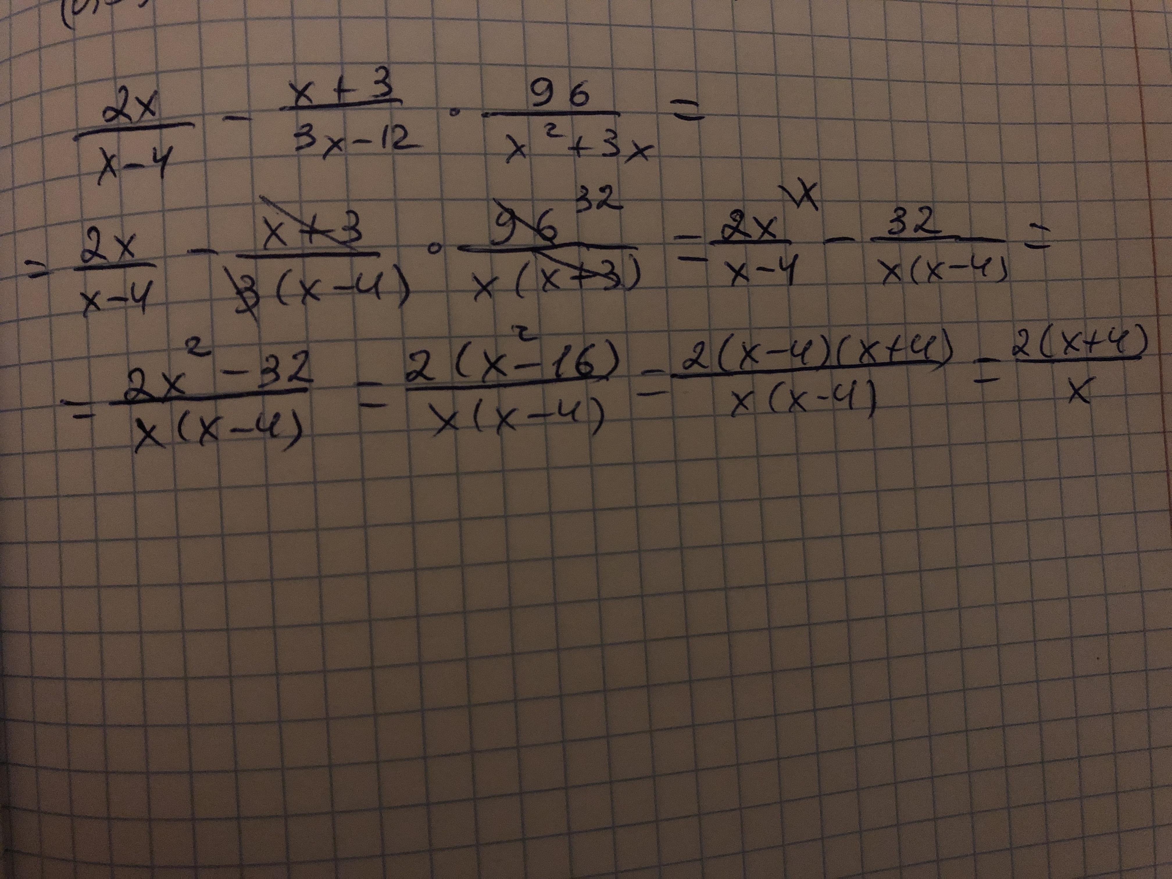 2х/(х-4)-((х+3)/(3х-12))*(96/(х²+3х))=(2х/(х-4)-(х+3)*96/(3*(х-4)*х(х+3))=