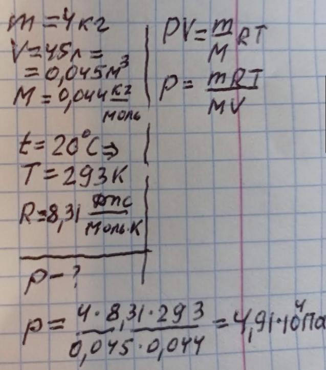 Маса вуглекислого газу 4 кг , його об'єм 45 літрів , а температура 20 С. Знайти тиск .