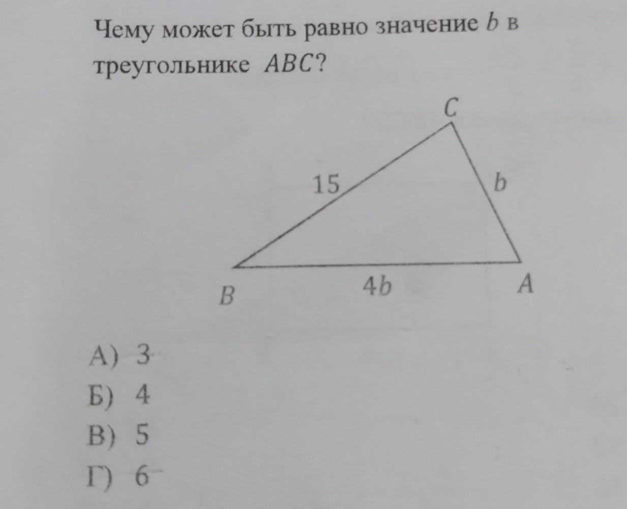 Чему может быть равно значение в в треугольнике АВС? b B A) 3 Б) 4 B) 5 Г) 6 15 4b A