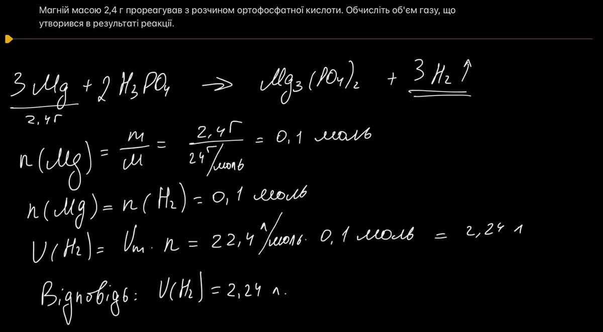 Магній масою 2,4 г прореагував з розчином ортофосфатної кислоти. Обчисліть об'єм газу, що утворився в результаті реакції.