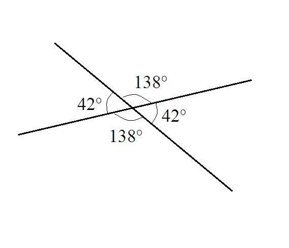 4. При пересечении двух прямых образуются две пары вертикальных или две пары смежных углов. Вертикальные угла равны ⇒ одна пара углов - 138°, сумма смежных углов 180° ⇒ второй угол в паре со смежным - (180-138)=42°. При пересечении двух прямых образовались углы: 42°, 138°, 42°, 138°.