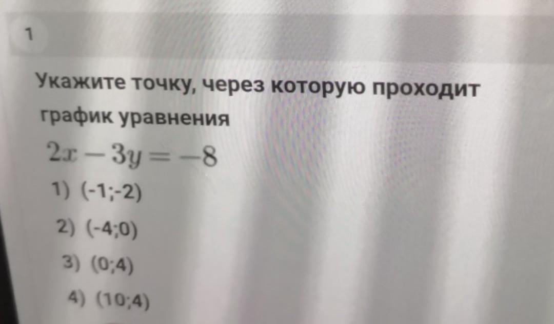 1 Укажите точку, через которую проходит график уравнения 2x-3y=-8 1) (-1;-2) 2) (-4;0) 3) (0:4) 4) (10;4)
