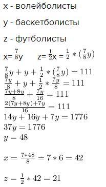Спортом занимаются 111 человек. Волейболисты состовляют 7/8 количество баскетболистов футболисты - 50%, количество волейболистов. Сколько человек занимаются футболом Волейболом баскетболом? Помогите пожалуйста. Надо решить уровнением. Даю 15 балов.