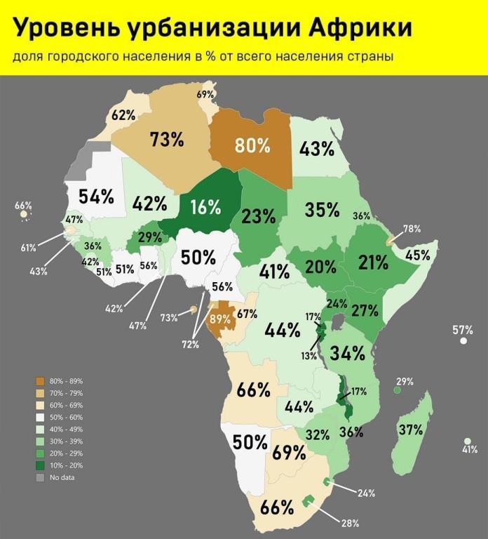 - 1.Чи є країни Африки достатньо урбанізованими?Да, в странах Африки есть достаточно урбанизированные государства.Если мы посмотрим на карту урбанизации Африки, которая дана ниже в приложении, то увидим что высокоурбанизированными являются Ливия, Алжир, ЮАР, Ботсвана, Ангола, Марокко, где урбанизация составляет порядка 62-80 %.