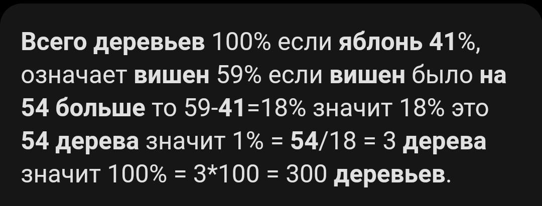 Пожалуйста помогите решить задачу: В саду растут яблони и вишни, причем яблони составляют 41% всех деревьев. Вишень растет на 54 дерева больше, чем яблонь. Сколько деревьев растет в саду? Заранее спасибо