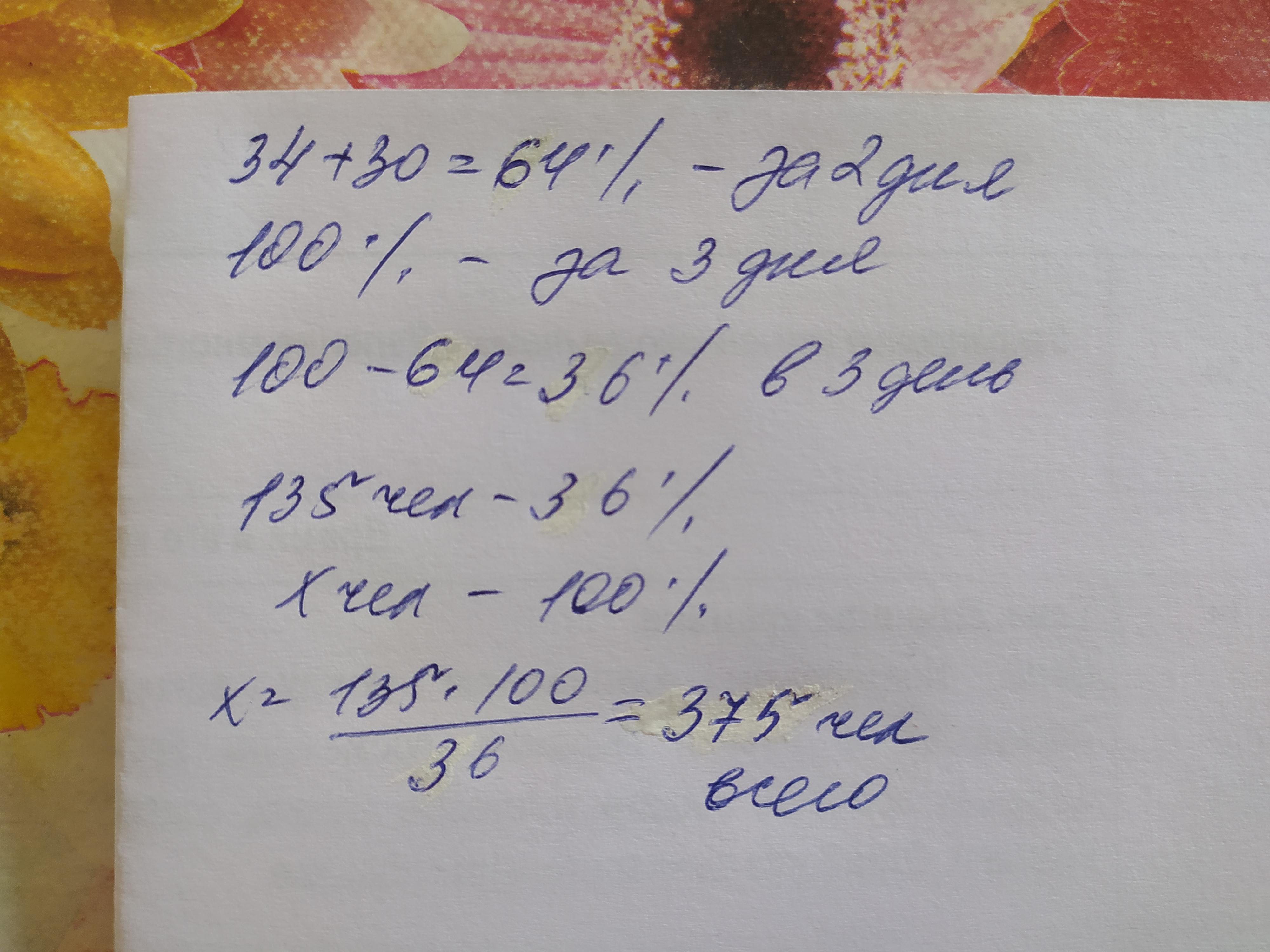 Спортивні змагання тривали три дні, Першого дня в них взяли участь 34% всіх учасників, другого - 30%, а третього-решта 135 чоловік. Скільки всього було учасників змагань?