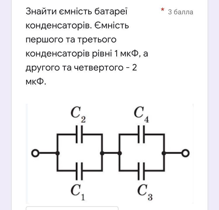 Знайти ємність батареї конденсаторів. Ємність першого та третього конденсаторів рівні 1 мкФ, а другого та четвертого - 2 мкФ.