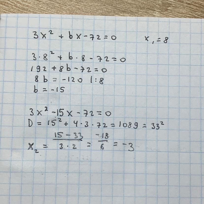 Один з коренів квадратного рівняння 3х 2 + bх -72 = 0 дорівнює 8.