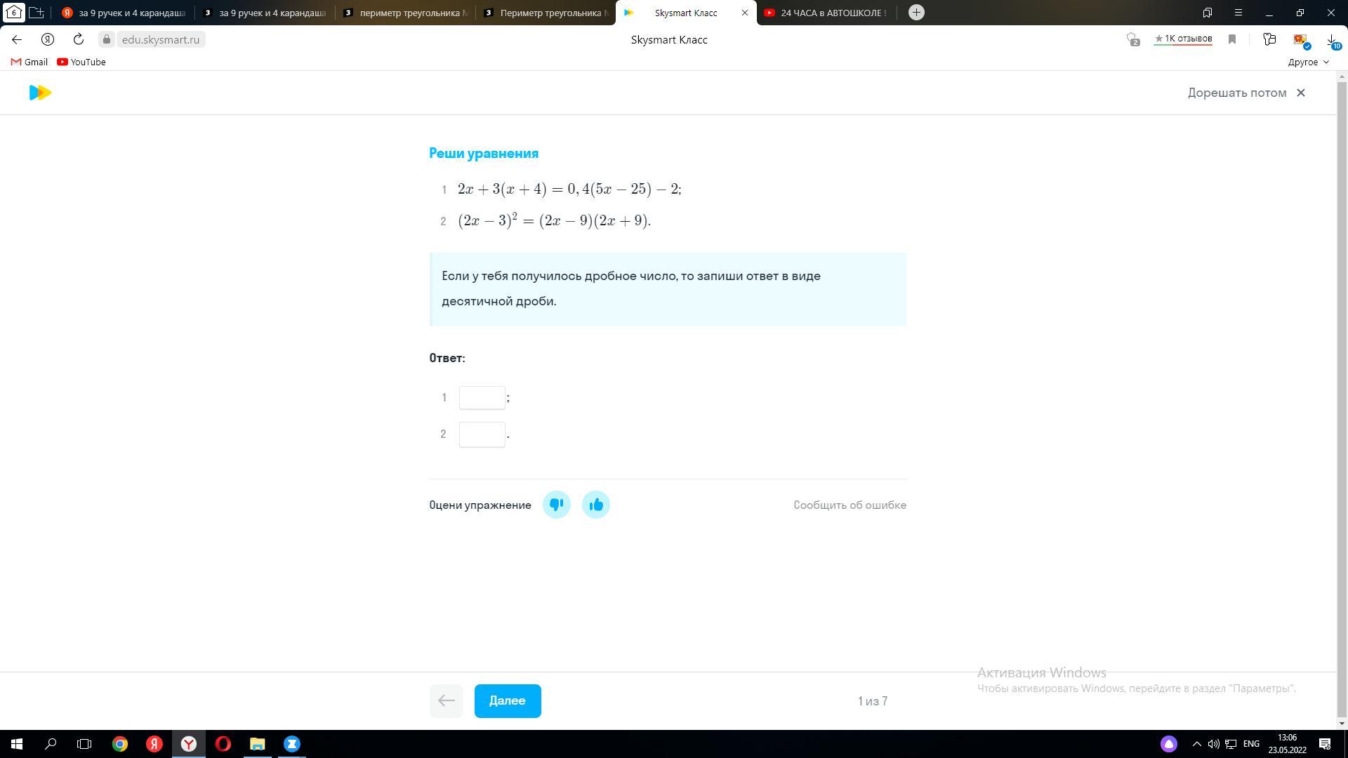 1. 2x+3(x+4)=0,4(5x-25) 2; 2x+3x+12=2x-10-2; 3x+12-10-2; 3x+12=-12; 3x=-12-12; 3х=-24; х=-8. 2. (2x-3)³=(2x-9)(2x9); 8x³-36x²+54x-27=(2x-9)18; 8x³36x²+54x-27-36x+162=0; 8x³+12x²-48x²+18x+135=0; 4x²(2x+3)-24x(2x+3)+45(2x+3)=0; (2x+3)(4x² -24x+45)=0; 2х+3=0; 4х²-24х+45=0; х= -3/2; х=-1,5
