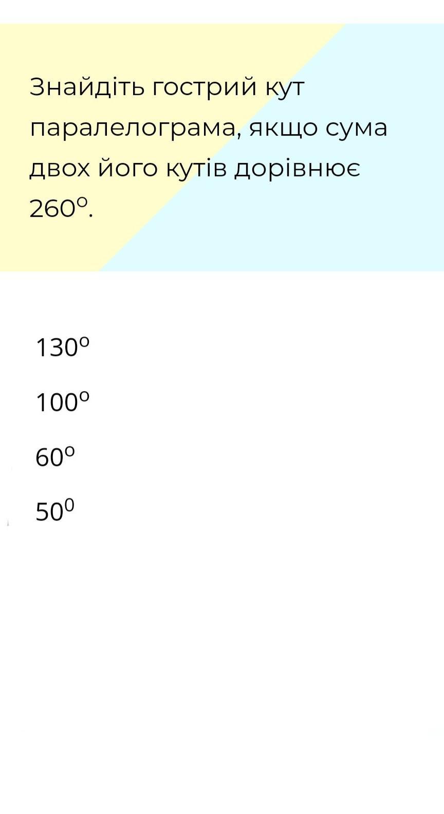 КутА + кутВ + кутС = кутД = 360° КУТА = кутС , кутВ = кутС кутА + кутВ =180° , кути по одній стороні паралелограма = 180° кут В + кутД = 260° , кутВ = кутД = 260°÷ 2 = 130° кутА = кутС = 180° -130° = 50°