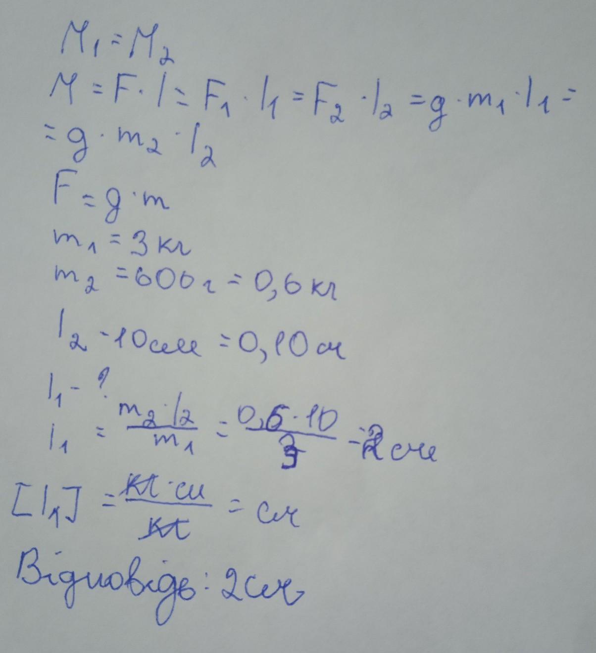 До меншого плеча важеля прикріпили тіло масою 3 кг, а до більшого 600 г. Довжин