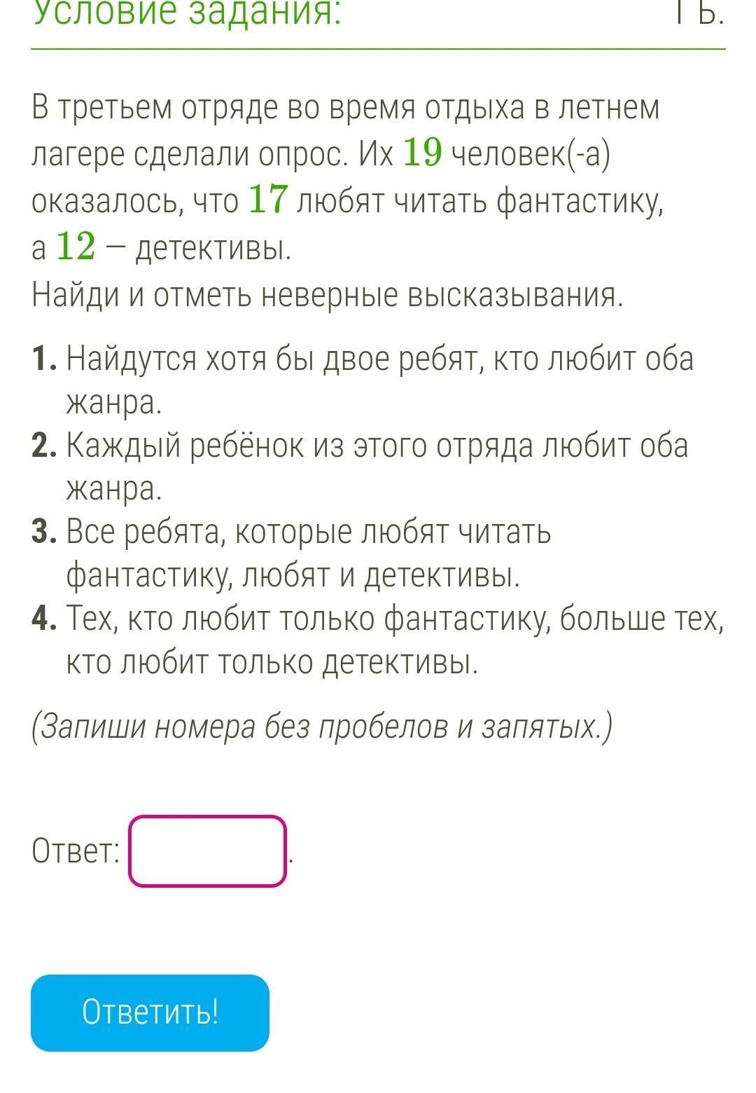 3. Ложь. Фантастику любят 17, а детективы 12, и оставшиеся 5 человек, выходит, точно не любят детективы.