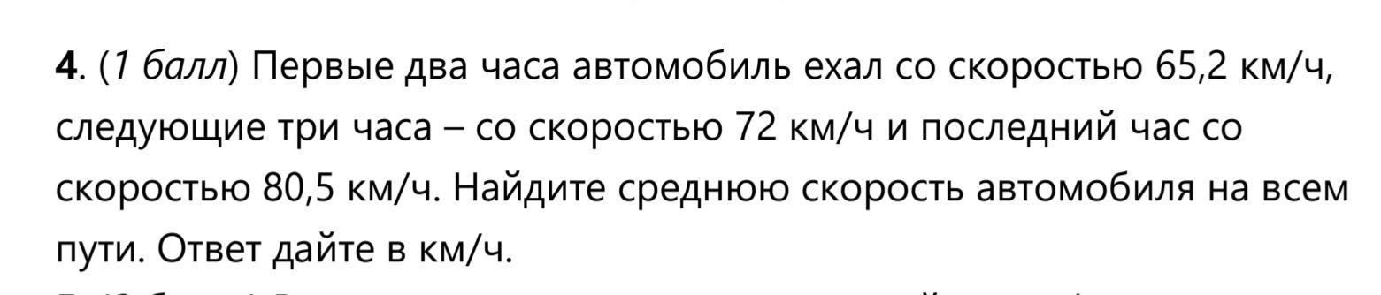 Ответ:(2*65,2+3*72+80,5):6=(130,4+216+80,5):6=426,9:6=71,15 км/ч средняя скорость