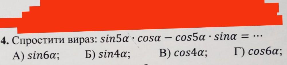 Спростити вираз: sin5a•cosa - cos5a•sina = ...