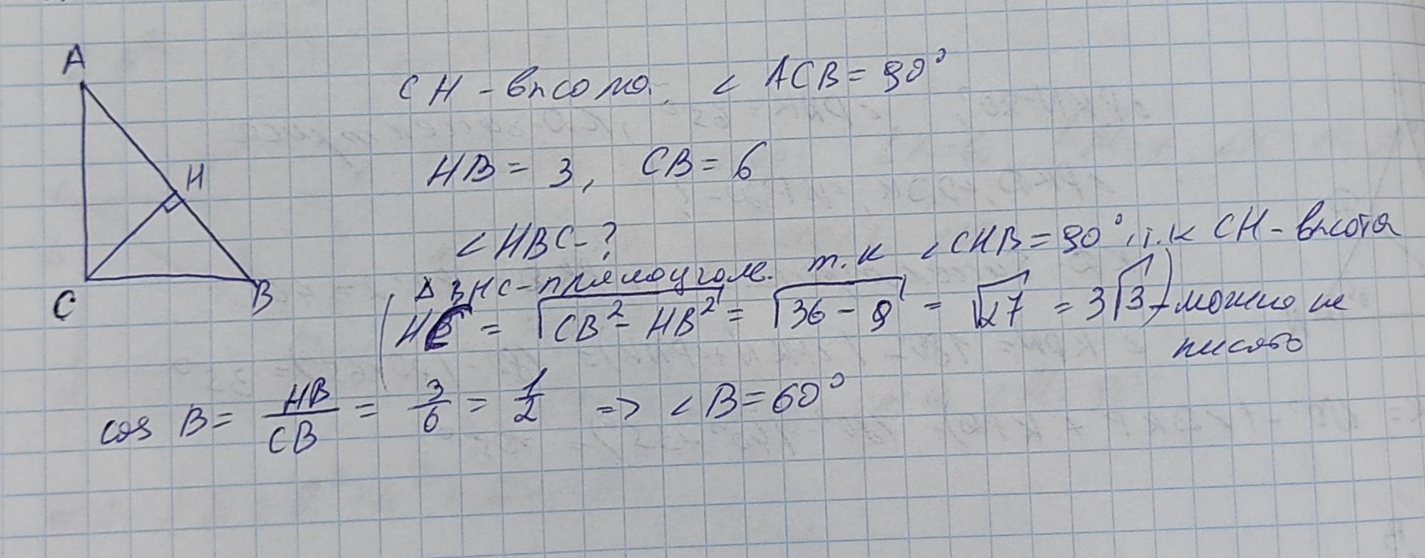 В прямоугольном треугольнике АВС из прямого угла С проведена Высота CH . Найди угол HBC,если HB=3 а CB=6