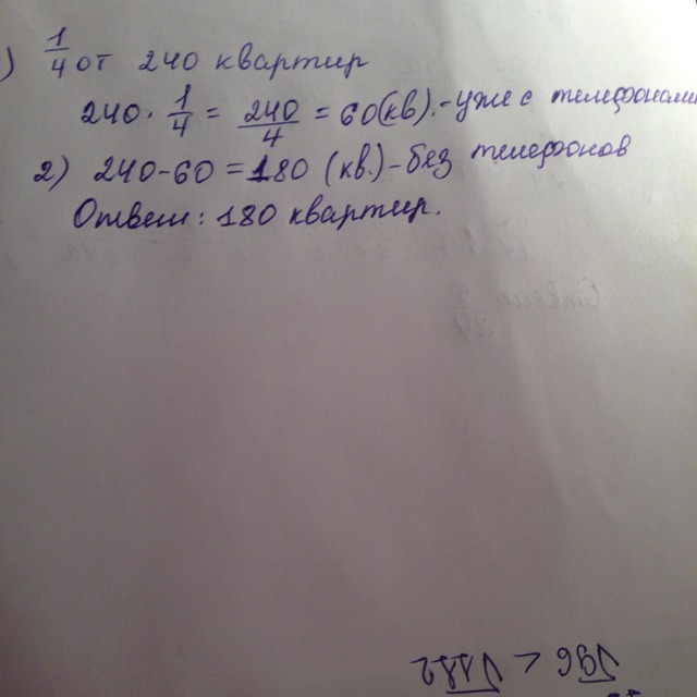 В ново доме 240 квартир. В четвертой части всех квартир уже поставлены телефоны. Сколько квартир в новом доме пока осталось без телефона ?