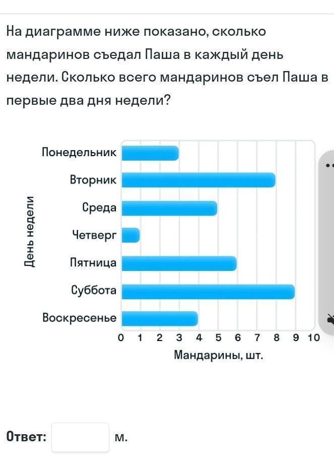 На диаграме ниже показано,сколько мандаринов съедал Паша в каждый день недели. Сколько всего мандаринов съел Паша?