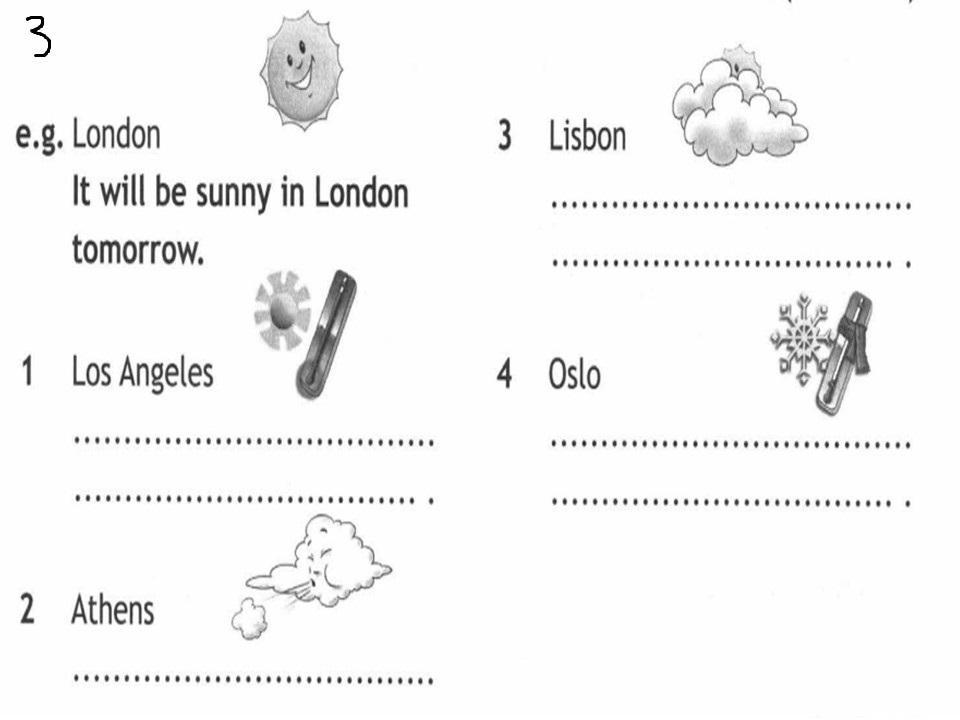 Напишите, какая погода будет завтра в данных городах. Обратите внимание на изображения погодных явлений и на пример. Используйте Future Simple tense (Будущее простое время). Предложения запишите в тетрадь.