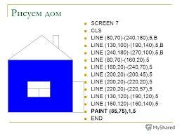график qbasic нарисовать дом, солнце и елка. Закрасить их.