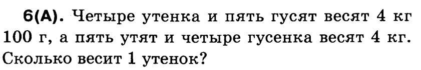 Складываем всех и получаем: 9 утят и 9 гусят весят 8 кг 100 г = 8100 г Значит, 1 утенок и 1 гусенок весят 8100/9 = 900 г. А 4 утенка и 4 гусенка весят 900*4=3600 г. А 4 утенка и 5 гусят весят 4100 г. Значит, 1 гусенок весит 4100 - 3600 = 500 г. А 1 утенок 900 - 500 = 400 г.