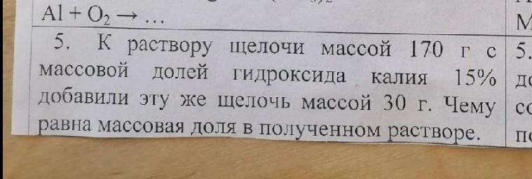 5. К раствору щелочи массой 170 г с массовой долей гидроксида калия 15% добавили эту же щелочь массой 30 г. Чему равна массовая доля в полученном растворе.