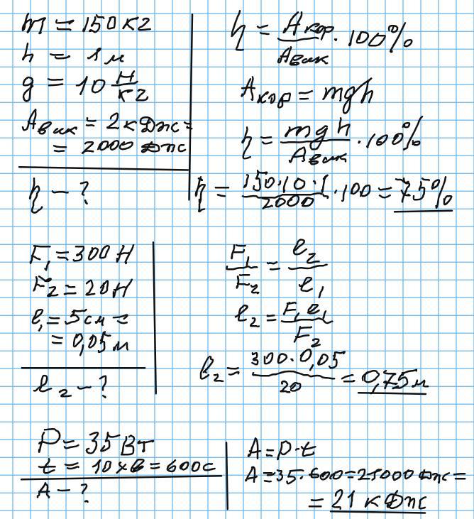 За допомогою важеля підняли вантаж масою 150 кг на 1 м. При цьому сила, яка прикладена до довгого кінця важеля, здійснила роботу 2 кДж. Який ККД важеля? У відповідь записати числове значення без одиниць вимірювання