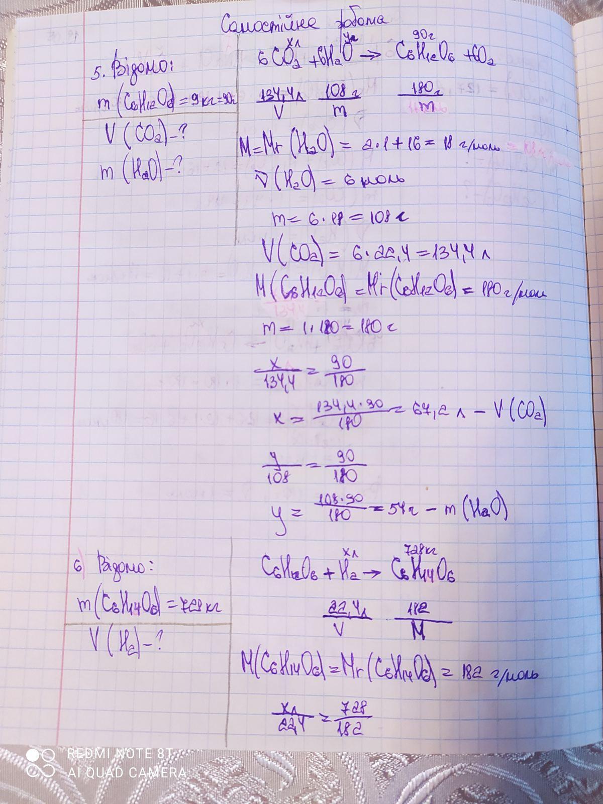 виділяється кисень. Обчисліть, який об'єм вуглекислого газу і масу води