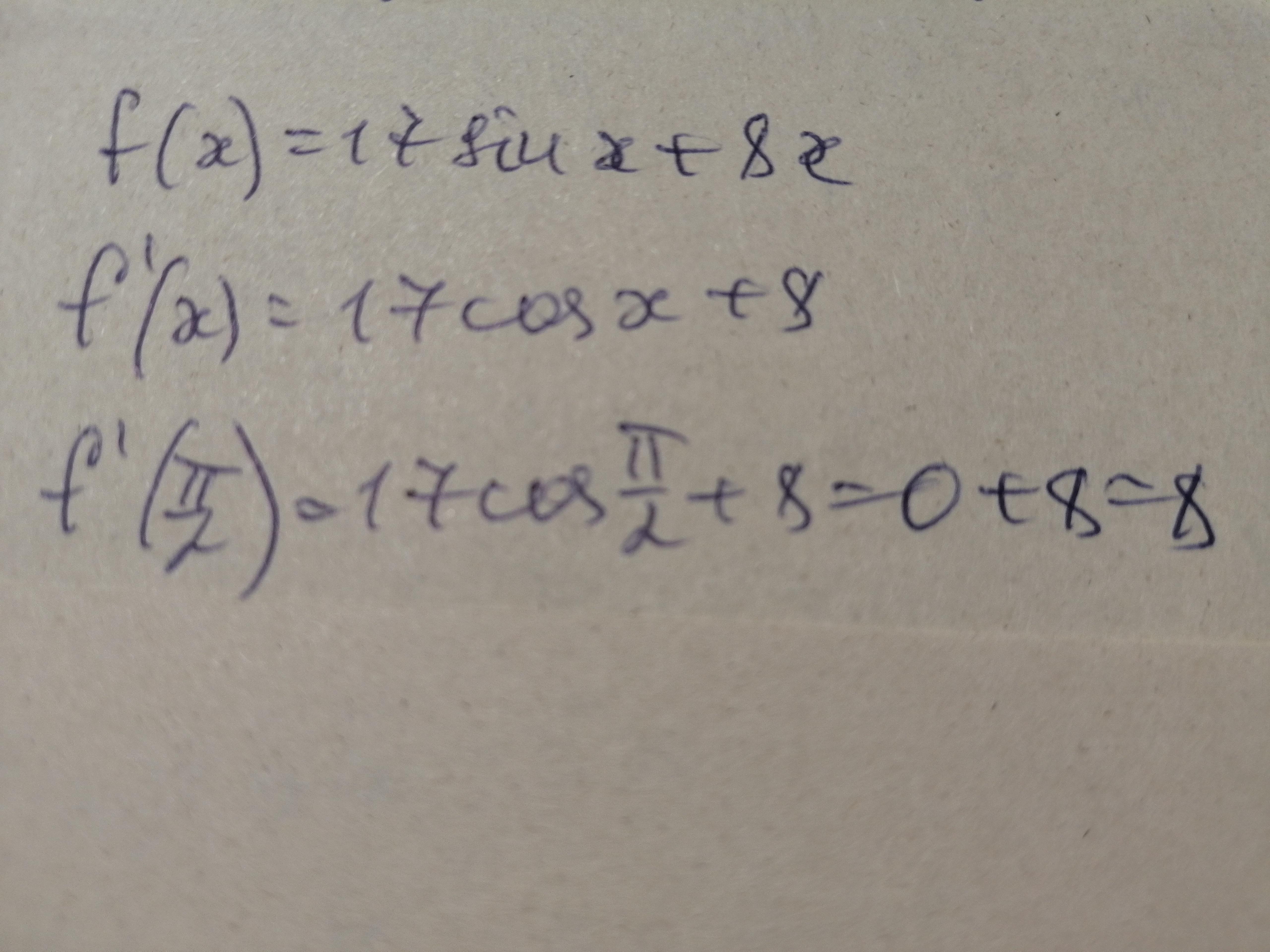 Обчисли кутовий коефіцієнт дотичної до графіку функції f(x)=17sinx+8x у точці з абсцисою x0=π/2.