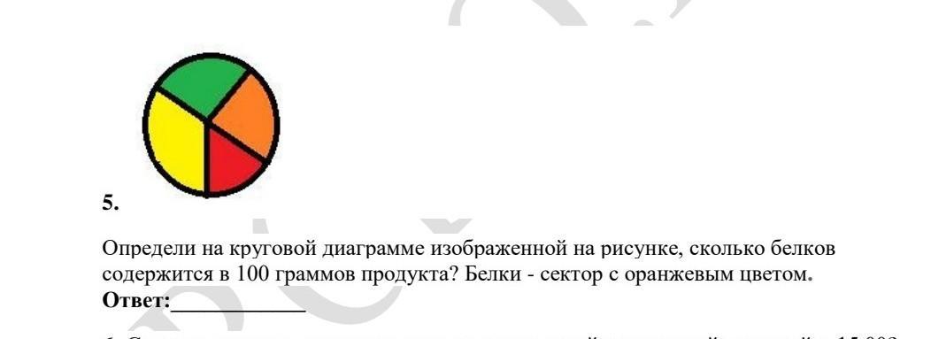 определи на круговой диаграмме ихображенной на рисунке, сколько белков сидержится в 100 граммов продуктов? Белки- сектор с оранжевым цветом