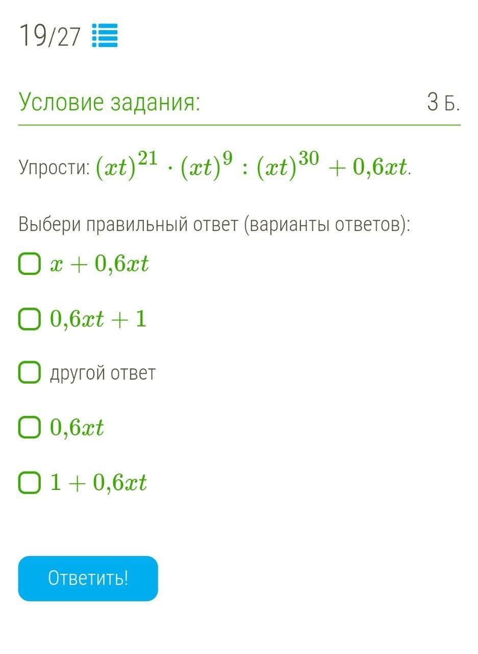 (xt)²¹ * (xt)⁹ : (xt)³⁰ + 0,6xt = xt^(21+9-30) + 0,6xt = (xt)⁰ + 0,6xt = 1 + 0,6xt