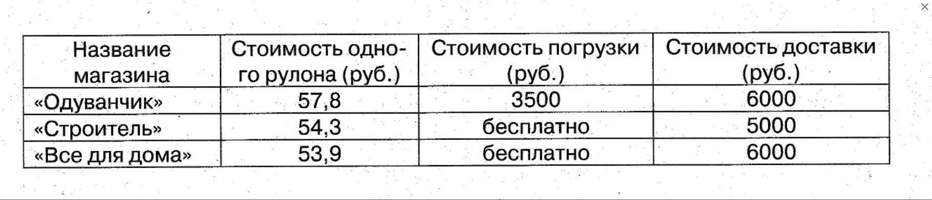 Строительной фирме нужно приобрести 400 рулонов рубероида. В таблице приведена стоимость рубероида в трех различных магазинах. Сколько рублей будет стоить самая дешевая покупка?