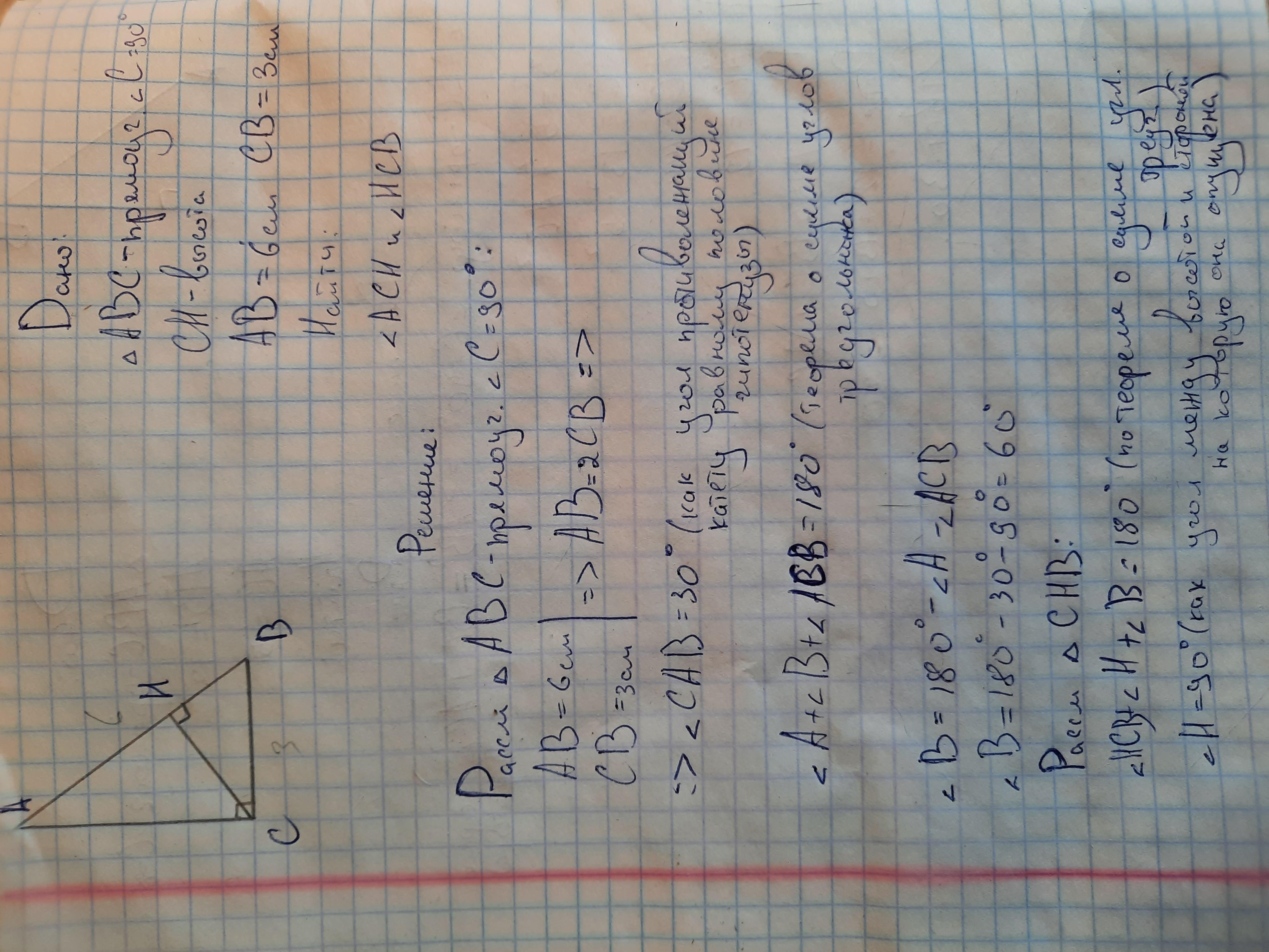 опущен перпендикуляр CH, AB = 6 см, CB = 3 см. Найти углы при