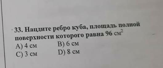 33. Найдите поверхности ребро куба, площадь полной которого равна 96 см² В) 6 см D) 8 см